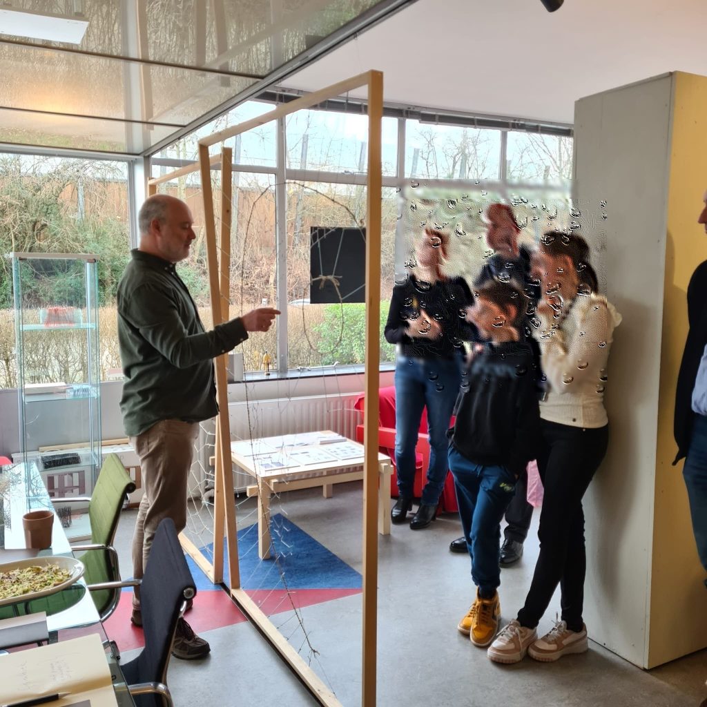 VLNR: De vier kunstenaars, Cor en Andre en ik in overleg over de inrichting. 3D-prints (Ernst) met maquettes (Cor), Zwarte vlakken (André) en Rietveldstoel, Uitleg, Ik (foto GJ de jong)